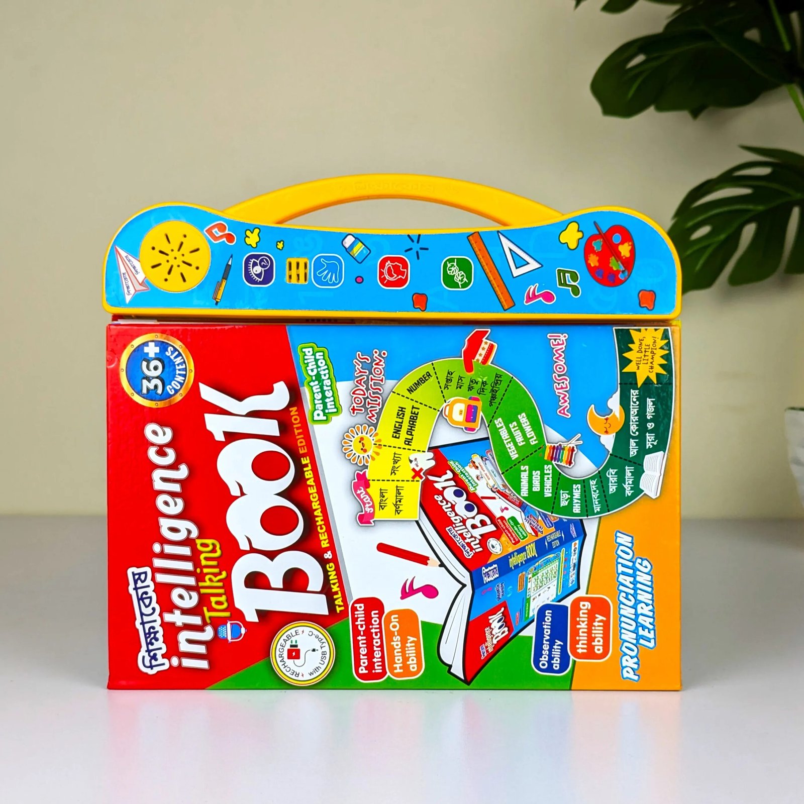 Intelligence Talking Book For Kids প্রধান বৈশিষ্ট্যসমূহ:বহু-ভাষিক শিক্ষা : সাধারণত বাংলা, ইংরেজি ও আরবি বর্ণমালা এবং সংখ্যা শেখার সুযোগ আছে ।৩৬+ বিষয়: বইটিতে বর্ণমালা, সংখ্যা, ফল, সবজি, প্রাণী, যানবাহন, মানবদেহের অঙ্গপ্রত্যঙ্গ, ইসলামিক সূরা ও গজল, ছড়া/গান সহ ৩৬টিরও বেশি ভিন্ন ভিন্ন অধ্যায় বা টপিকস অন্তর্ভুক্ত আছে।ইন্টারেক্টিভ টাচ সিস্টেম: বইয়ের কোনো ছবি বা লেখাতে চাপ দিলে সেটি স্পষ্ট শব্দে উচ্চারণ করে, যা শিশুদের উচ্চারণ এবং শব্দভাণ্ডার বাড়াতে সাহায্য করে।রাইটিং বোর্ড : এর সাথে একটি মুছে ফেলা যায় এমন রাইটিং বোর্ড বা গ্রাফিতি বোর্ড আছে, যেখানে শিশুরা আঁকাআঁকি ও লেখালেখির অনুশীলন করতে পারে।চরিচার্জেবল: রিচার্জেবল সুবিধা আছে, যা ব্যাটারি পরিবর্তনের ঝামেলা কমায়। সুবিধাঃসহজ ও মজাদার শিক্ষা: এটি শেখাকে খেলার মতো মজার করে তোলে এবং শিশুদের মনোযোগ ধরে রাখতে সাহায্য করে।উচ্চারণ অনুশীলন: সঠিক উচ্চারণ শুনতে পাওয়ায় শিশুদের ভাষার দক্ষতা বৃদ্ধি পায়।মস্তিষ্কের বিকাশ: রঙিন ছবি, শব্দ এবং কুইজ ফাংশন থাকার কারণে এটি শিশুদের মনোযোগ, স্মৃতিশক্তি এবং সৃজনশীলতা বাড়াতে সহায়তা করে।স্ব-শিক্ষণ (Self-Learning): শিশুরা নিজে নিজে শিখতে উৎসাহিত হয়।এটি একটি All-in-One ধরনের খেলনা-কাম-শিক্ষণ উপকরণ যা প্রিস্কুল বা প্রাথমিক স্তরের শিশুদের জন্য খুবই কার্যকর।