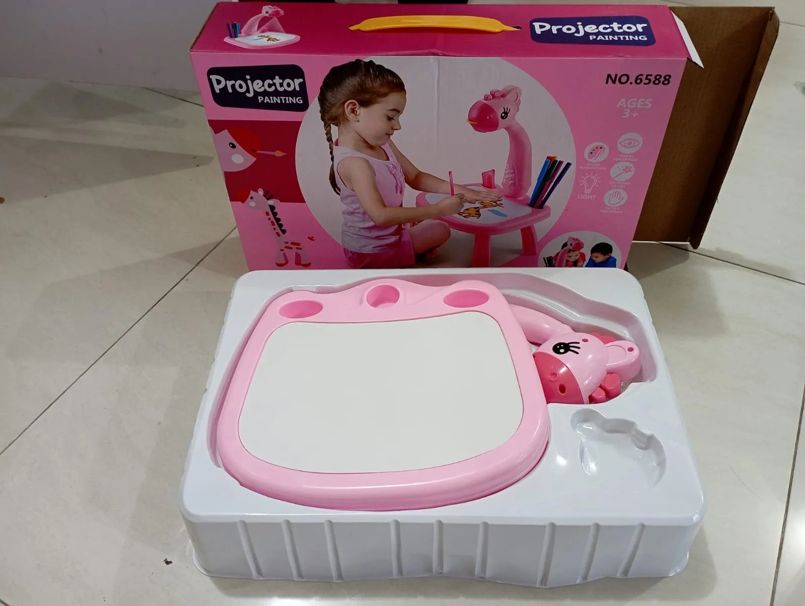 FUNNY PROJECTOR TOY: Come with a high quality projector, just turn down the lights, switch on the projector and insert a preprinted slide and trace away. Then colour in or paint the picture. Project an image that your child can draw along the picture.GREAT EDUCATIONAL TOY: Doodle toy is baby’s love. This funny projector toy enables your kids to express themselves artistically. It can improve your kids’ creativity and imagination, exercise hand-eye coordination & color perception ability.ATTRACTIVE & INNOVATIVE: Make play time fun with this cute projector, this will help and encourage children to learn draw and paint while having fun. Attractive and durable intelligent toy, modern and elegant in fashion, light projector innovative technology.SAFE & DURABLE MATERIAL: Made of high quality ABS material, smooth edge and surface will not hurt your baby’s hand. Non- toxic paintbrush, it can be used with complete confidence.PERFECT GIFT FOR KIDS: Come to help your little artist to make their own works, it is also a communicative link between you and your baby. Suit for birthday, holiday or Christmas gift. Children will enjoy exploring their creativity, it is easy to create nice pictures even for 3 year old.Product Dimensions: 25 x 0.03 x 35.5 cm