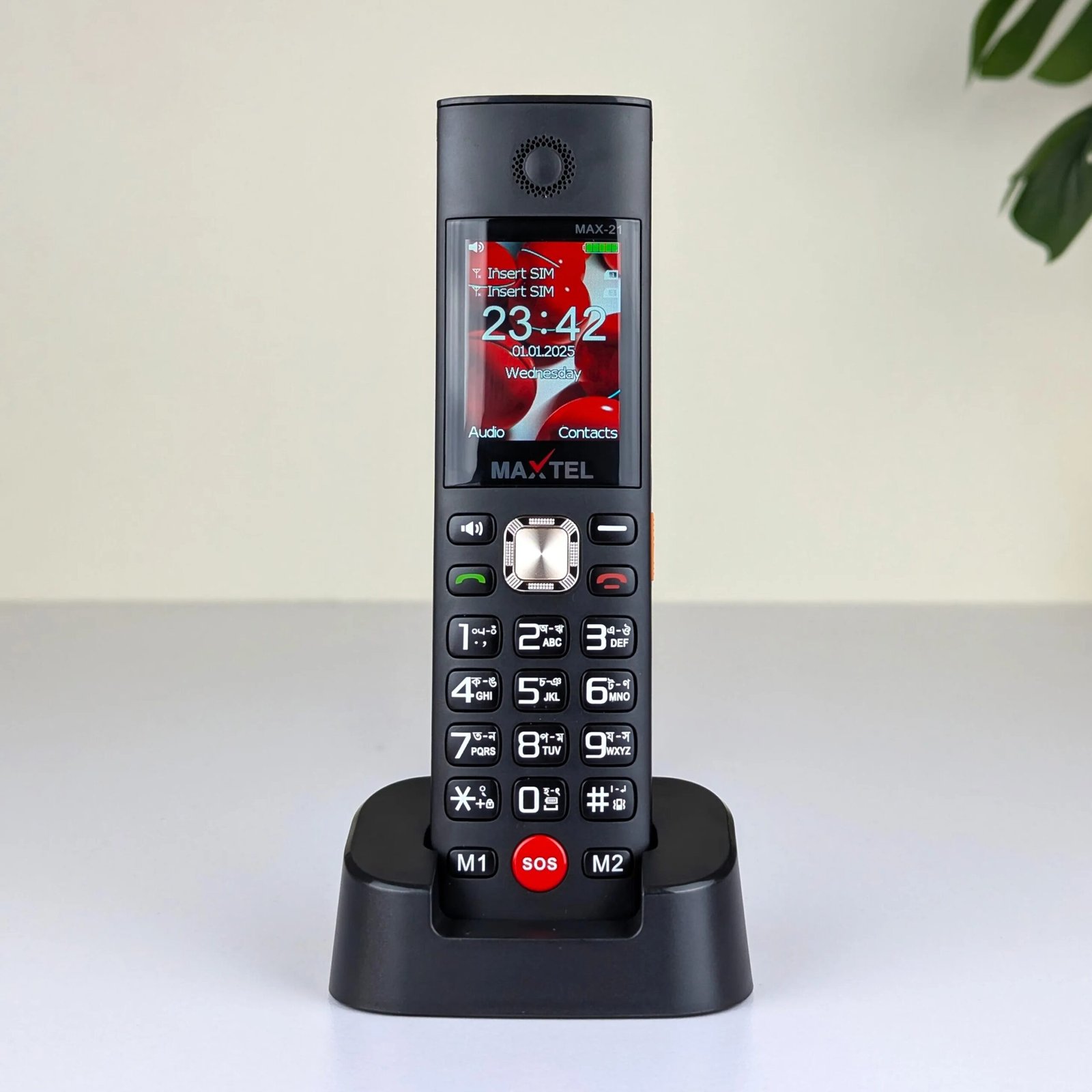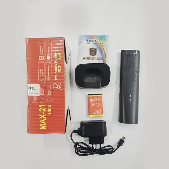 MAXTEL MAX21 Ultra Cordless Phone Dual Sim Black Brand : MAXTELModel : MAX-21Display Size : 2 inch TFTMTK ChipsetSim : 2 SIM Cardmemory Card Supported 32GB ( not incluted )Big Battery 3000mAhLoud SpeakerDock Charging SupportWirless FMStrong Torch LightAuto Call RecordingVibrationType C Charging PortSOS With 5 NumberTwo Family Button8 Speed DialCalendar,CalculatorKeypad Lock,P3,MP4BluetoothPackage Included:1* MAXTEL MAX21 Ultra Cordless Phone Black1* Dock Charger1* Type-C Charger1* Warranty Card