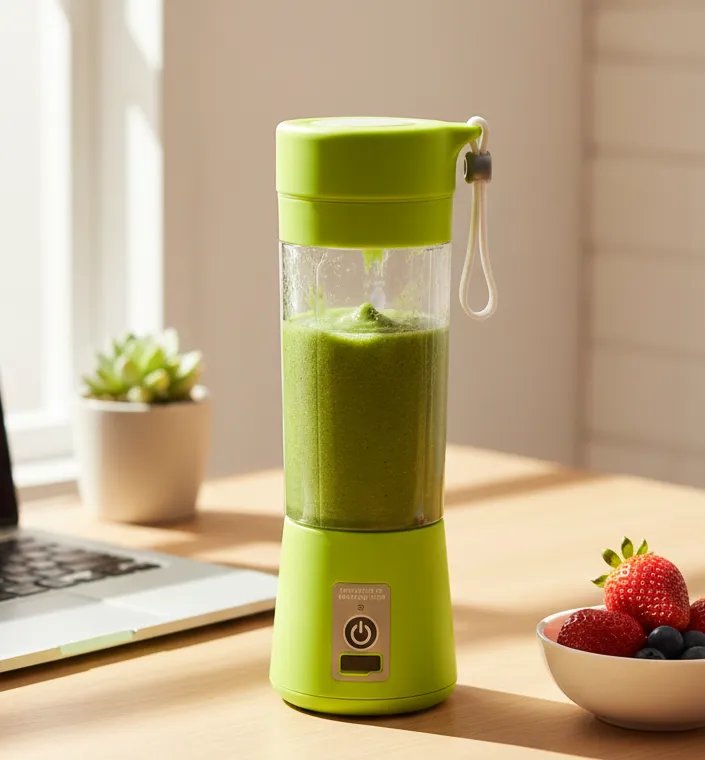 Portable and Rechargeable Battery Juice Blenderযদি আপনি প্রায়শই চলাফেরার মধ্যে থাকেন এবং স্বাস্থ্যকর স্মুদি বা জুস পানের অভ্যাস বজায় রাখতে চান, তবে পোর্টেবল ব্লেন্ডার আপনার জন্য খুবই উপকারী এবং সুবিধাজনক একটি ডিভাইস হতে পারে।প্রধান বৈশিষ্ট্য:ধারণক্ষমতা (Capacity): প্রতিটি ব্লেন্ডারের ধারণক্ষমতা 380 ml (মিলিলিটার), যা একক পরিবেশনের জন্য উপযুক্ত।পোর্টেবল (Portable): এর প্রধান সুবিধা হলো এটি আকারে ছোট এবং হালকা। এর সাথে একটি স্ট্র্যাপ (strap) বা বহন করার সুবিধা থাকে, যা এটিকে জিমে, অফিসে, বা ভ্রমণে সহজে নিয়ে যাওয়া যায়।রিচার্জেবল ব্যাটারি (Rechargeable Battery): এটি বিদ্যুতের প্লাগে না লাগিয়ে ব্যাটারির সাহায্যে চালানো যায়। এটি USB-এর মাধ্যমে চার্জ করা যায় (যেমন পাওয়ার ব্যাংক, ল্যাপটপ বা ফোনের চার্জার)।ব্যবহারের সুবিধা: এটি ফলমূল, সবজি, প্রোটিন পাউডার বা সাপ্লিমেন্ট মিশিয়ে স্মুদি, জুস বা মিল্কশেক তৈরি করার জন্য আদর্শ।নিরাপত্তা সতর্কতা: বাক্সে লেখা আছে “PROHIBITION OF EMPTY ROTATION” অর্থাৎ, ব্লেন্ডারটি খালি অবস্থায় ঘোরানো/চালানো উচিত নয়।
